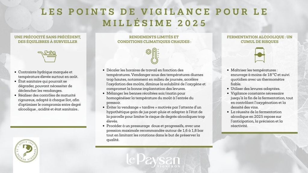Qu’il s’agisse du calendrier de récolte, de l’organisation des flux au chai, de la gestion des températures, du choix des levures, des apports nutritionnels ou de la conservation post-fermentaire, chaque décision doit être pensée, argumentée et suivie. Les marges de manœuvre existent, mais elles sont étroites. Ce n’est pas l’ampleur des moyens qui fera la différence cette année, mais bien la précision et la réactivité dans leur mise en œuvre.