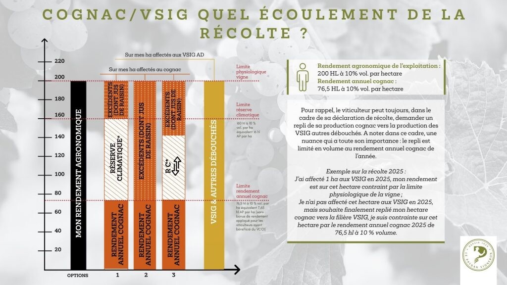 Les itinéraires de vendange « tardive », parfois ancrés dans les habitudes culturales ou motivés par l’attente d’un hypothétique gain de jus post-pluie, pourraient cette année s’avérer contre-productifs et pas nécessairement gagnants, d’autant plus avec un rendement annuel cognac bas fixé pour rappel à 7,65 hl AP par hectare. Le risque est double :