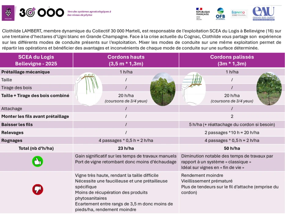 Clothilde LAMBERT, membre dynamique du Collectif 30 000 Martell, est responsable de l’exploitation SCEA du Logis à Bellevigne (16) sur une trentaine d’hectares d’Ugni blanc en Grande Champagne. Face à la crise actuelle du Cognac, Clothilde vous partage son expérience sur les différents modes de conduite présents sur l’exploitation. Mixer les modes de conduite sur une même exploitation permet de répartir les opérations et bénéficier des avantages et inconvénients de chaque mode de conduite sur une surface déterminée.